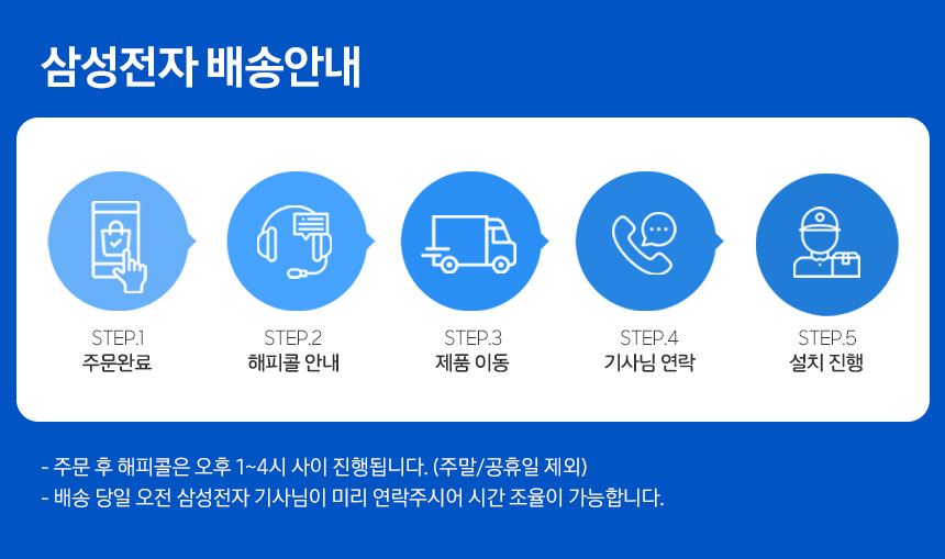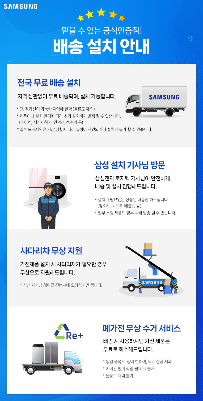 교환/반품 안내 | - 설치완료 상품의 하자가 없는 경우 교환/반품이 불가합니다. - 제품 자체에 하자가 있는 경우 삼성전자 서비스센터 A/S 기사의 판정을 거친 후 소비자분쟁해결기준에 의거하여 삼성전자 서비스센터를 통해 교환/환불/수리해드립니다. |